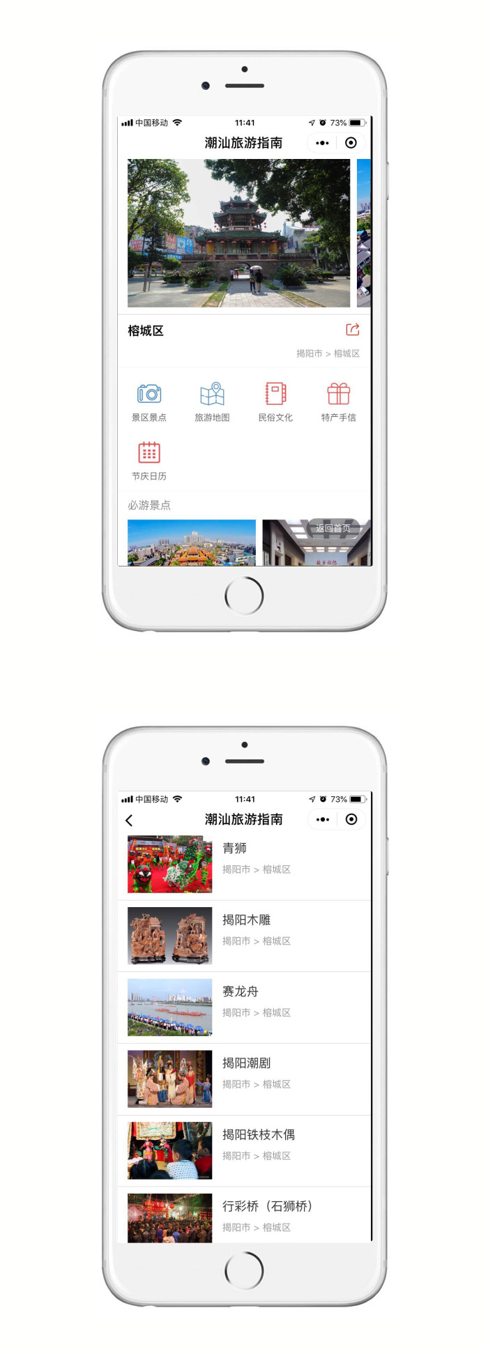 榕城区位于揭阳市的中心,有着悠久的历史,辖区有揭阳学宫、进贤门、骑楼街区等历史古迹。潮趣科技帮助榕城区旅游局设计制作了榕城区智慧旅游小程序,并关联至官方微信公众号。